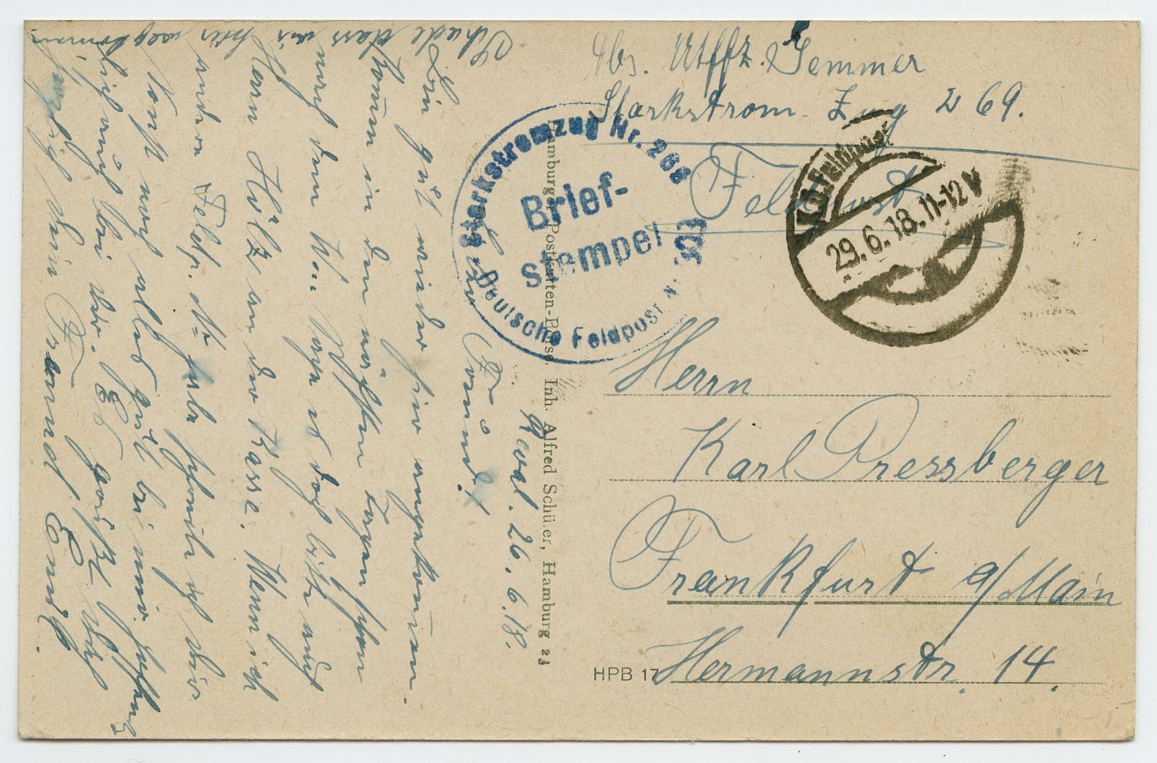 1918 German field post card from unit “Starkstormzug 269”, Reval-Frankfurt